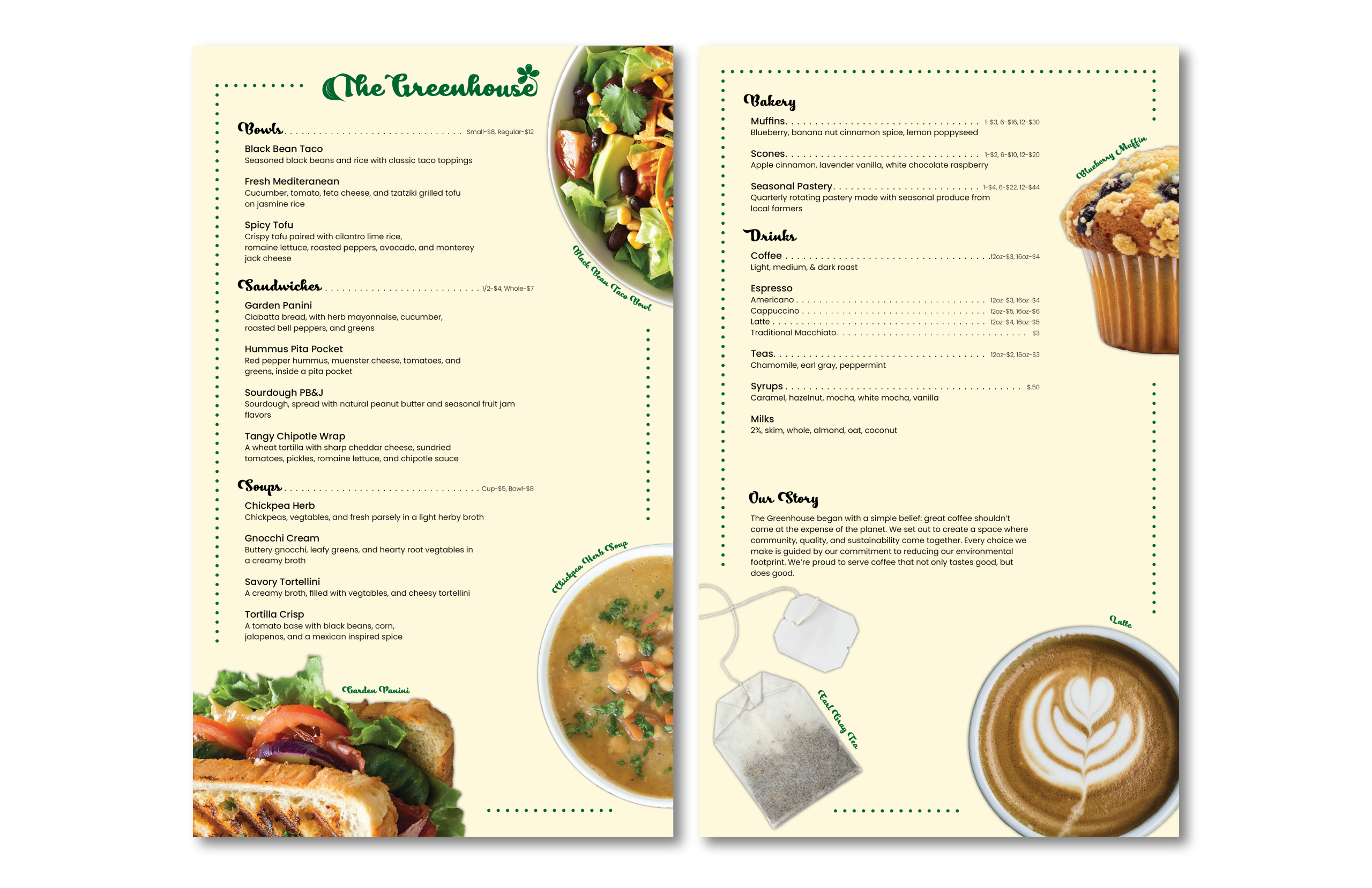 Menu, gift card, & shirt designThe Greenhouse is a fictional cafe created in the style of a small local business. The logo was made with the intention of being fresh and new, without the heavy reliance on current cafe trends that will quickly become old news. I created the color palette to represent The Greenhouse’s environmental values. The images of food were placed half-on, half-off because I wanted to display the food while giving the menu a modern look. The menu is made to be printed double-sided on legal sizepaper, this decision was made to keep printing costs down for the local business archetype The Greenhouse represents.